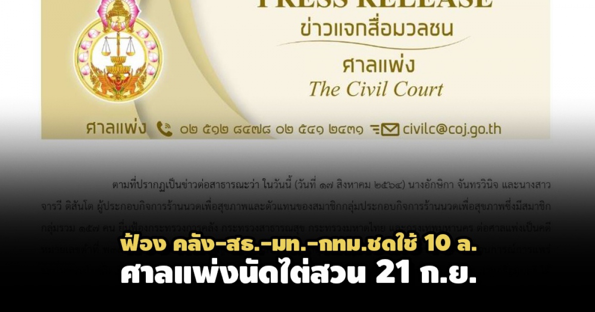 ศาลแพ่งประทับรับฟ้อง! ตัวแทนผู้ประกอบการร้านนวดเพื่อสุขภาพ 157 ราย ยื่นฟ้อง ก.คลัง-สธ.-มท.-กทม. ขอให้ชดใช้ รวมกันกว่า 10 ล้าน เหตุนายกฯ-อนุทิน ปล่อยปละละเลย-ประมาทเลินเล่อ ทำโควิด-19 ระบาด นัดไต่สวนคำร้อง 21 ก.ย.