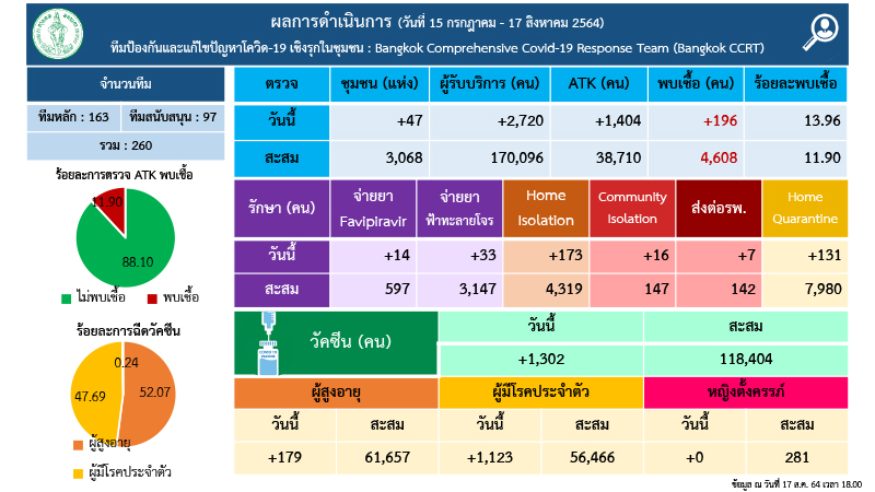 สำหรับผลการดำเนินงานโดยกลุ่ม CCRT ในพื้นที่ กทม.ระหว่างวันที่ 15 ก.ค.-17 ส.ค.2564 ระบุว่า ลงพื้นที่อีก 47 ชุมชน รวมสะสม 3,068 ราย ตรวจหาเชื้อด้วย Antigen Test Kit เพิ่มอีกจำนวน 1,404 ราย พบเชื้อ 196 ราย รวมสะสม 4,608 ราย ส่งเข้าสู่ระบบการรักษาเรียบร้อยแล้ว