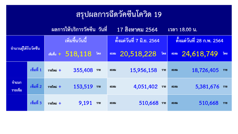 นอกจากนั้น มีผู้ได้รับวัคซีนเข็มแรกเพิ่ม 355,408 ราย เข็มที่ 2 เพิ่ม 153,519 ราย และเข็มที่ 3 เพิ่ม 9,191 ราย รวมสะสม 24,618,749 โดส แบ่งเป็น ผู้ได้รับเข็มแรก จำนวน 18,726,405 ราย เข็มที่ 2 จำนวน 5,381,676 ราย และเข็มที่ 3 จำนวน 510,668 ราย