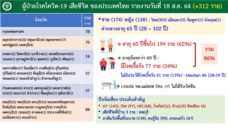 ในจำนวนนี้เป็นผู้สูงอายุ 194 คิดเป็น 62% และผู้ป่วย 7 กลุ่มโรคเรื้อรัง 77 ราย คิดเป็น 24% ซึ่งหากรวมกันพบมีอัตราการเสียชีวิตสูงถึง 86% ขณะเดียวกันมีผู้เสียชีวิตที่บ้าย 3 ราย และมีปัจจัยเสี่ยงต่อการติดเชื้อ มาจากในครอบครัว คนรู้จัก และอาศัยหรือเดินทางเข้าไปในพื้นที่ระบาด