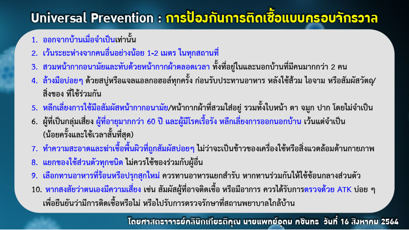 6) ผู้สูงอายุ และผู้มีโรคเรื้อรัง หลีกเลี่ยงการออกนอกบ้าน 7) ทำความสะอาดและฆ่าเชื้อพื้นผิวที่ถูกสัมผัสบ่อยๆ 8) แยกของใช้ส่วนตัวทุกชนิด 9) เลือกทานอาหารที่ร้อนหรือปรุงสุกใหม่ และ 10) หากสงสัยว่าตนเองมีความเสี่ยง ควรได้รับการตรวจด้วย ATK บ่อยๆ