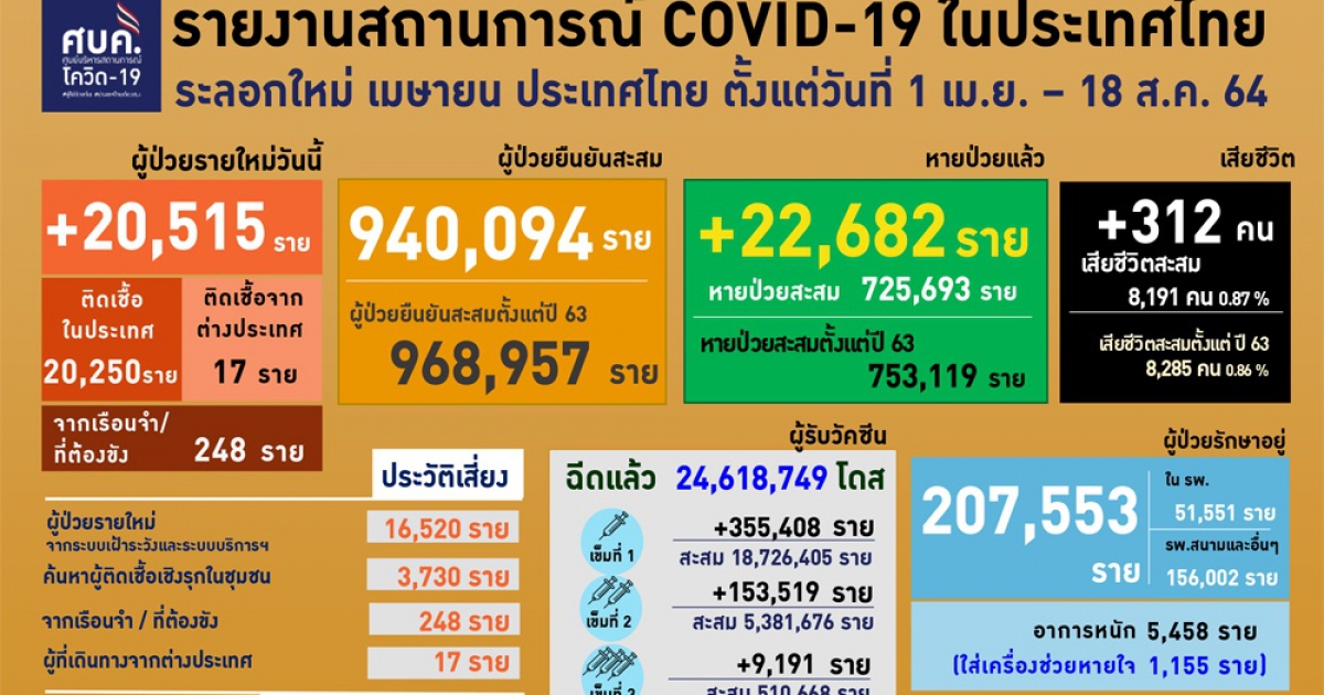 สำนักข่าวอิศรา (www.isranews.org) รายงานว่า เมื่อวันที่ 18 ส.ค.2564 พญ.อภิสมัย ศรีรังสรรค์ ผู้ช่วยโฆษกศูนย์บริหารสถานการณ์โควิด (ศบค.) รายงานสถานการณ์ประจำวัน พบผู้ป่วยรายใหม่ 20,515 ราย ติดเชื้อในประเทศ 20,498 ราย มาจากระบบบริการ 16,520 ราย เกิดจากการตรวจคัดกรองเชิงรุก 3,730 ราย ติดเชื้อในเรือนจำ 248 ราย และอีก 17 รายเดินทางกลับจากต่างประเทศ ทำให้มีผู้ป่วยสะสมจากการระบาดทั้งหมด 968,957 ราย และมีผู้ติดเชื้อเข้าข่าย (ATK) อีก 7,210 ราย อยู่ระหว่างยืนยันด้วย RT-PCR