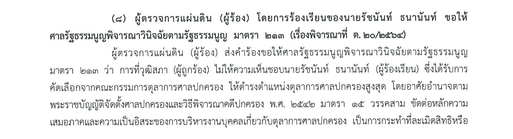 ผู้สื่อข่าวรายงานว่า เมื่อวันที่ 18 ส.ค. 2564 สำนักงานศาลรัฐธรรมนูญ เผยแพร่คำวินิจฉัยของศาลรัฐธรรมนูญหลายกรณี โดยมีประเด็นที่น่าสนใจ เรื่องพิจารณาที่ ต.20/2564 กรณีผู้ตรวจการแผ่นดิน (ผู้ร้อง) โดยการร้องเรียนของนายรัชนันท์ ธนานันท์ ขอให้ศาลรัฐธรรมนูญพิจารณาวินิจฉัยตามรัฐธรรมนูญ มาตรา 213 กรณีที่วุฒิสภา (ส.ว.) ผู้ถูกร้อง ไม่ให้ความเห็นชอบนายรัชนันท์ (ผู้ร้องเรียน) ซึ่งได้รับการคัดเลือกจากคณะกรรมการตุลาการศาลปกครอง ให้ดำรงตำแหน่งตุลาการศาลปกครองสูงสุด โดยอาศัยอำนาจตาม พ.ร.บ.จัดตั้งศาลปกครองและวิธีพิจารณาคดีปกครอง พ.ศ. 2542 มาตรา 15 วรรคสาม ขัดต่อหลักความเสมอภาคและความเป็นอิสระของการบริหารงานบุคคลเกี่ยวกับตุลาการศาลปกครอง เป็นการกระทำที่ละเมิดสิทธิหรือเสรีภาพที่รัฐธรรมนูญคุ้มครองไว้ ขัดหรือแย้งต่อรัฐธรรมนูญ มาตรา 27 และมาตรา 198 และขอให้สั่งเพิกถอนมติหรือการกระทำของผู้ถูกร้องดังกล่าว