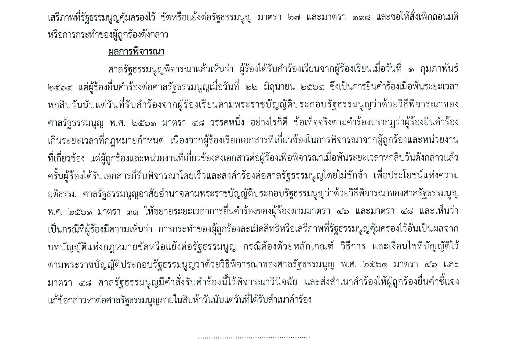 ศาลรัฐธรรมนูญ พิจารณาแล้วเห็นว่า ผู้ร้อง ได้รับคำร้องเรียนจากผู้ร้องเรียนเมื่อวันที่ 1 ก.พ. 2564 แต่ผู้ร้องยื่นคำร้องต่อศาลรัฐธรรมนูญ เมื่อวันที่ 22 มิ.ย. 2564 เป็นการยื่นคำร้องเมื่อพ้นระยะเวลา 60 วัน นับแต่วันที่รับคำร้องจากผู้ร้องเรียนตาม พ.ร.บ.ประกอบรัฐธรรมนูญว่าด้วยวิธีพิจารณาของศาลรัฐธรรมนูญ พ.ศ. 2561 มาตรา 48 วรรคหนึ่ง