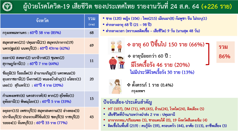 โดยมีผู้เสียชีวิต 226 ราย มาจากกทม.และปริมณฑล 137 ราย 4 จังหวัดภาคใต้ 8 ราย จังหวัดอื่น 79 ราย และเรือนจำ 2 ราย ในจำนวนนี้เป็นผู้สูงอายุ 150 คิดเป็น 66% และผู้ป่วย 7 กลุ่มโรคเรื้อรัง 46 ราย คิดเป็น 20% ซึ่งหากรวมกันพบมีอัตราการเสียชีวิตสูงถึง 86% ขณะเดียวกันมีผู้เสียชีวิตที่บ้านหรือระหว่างนำส่ง 2 รายในจังหวัดปทุมธานี เป็นหญิงตั้งครรภ์ 1 ราย และมีปัจจัยเสี่ยงต่อการติดเชื้อ มาจากในครอบครัว คนรู้จัก อาศัยหรือเดินทางเข้าไปในพื้นที่ระบาด และมีอาชีพเสี่ยง
