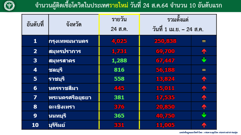 สำหรับจำนวนผู้ติดเชื้อในประเทศรายใหม่ 10 จังหวัดอันดับสูงสุด ประกอบด้วย กทม. 4,025 ราย สมุทรปราการ 1,731 ราย สมุทรสาคร 1,288 ราย ชลบุรี 816 ราย ราชบุรี 558 ราย นครราชสีมา 445 ราย อยุธยา 381 ราย ฉะเชิงเทรา 376 ราย นนทบุรี 365 ราย และบุรีรัมย์ 331 ราย