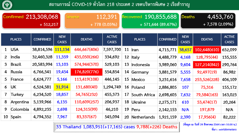 ขณะที่สถานการณ์ทั่วโลกพบผู้ป่วยเพิ่ม 512,217 ราย รวม 213,308,068 ราย อาการหนัก 112,391 ราย หายป่วย 190,855,688 ราย เสียชีวิต 4,453,760 ราย โดยสหรัฐอเมริกาพบผู้ป่วยเพิ่ม 111,134 ราย รวม 38,814,596 ราย เสียชีวิตเพิ่ม 406 ราย รวม 646,667 ราย อินเดีย พบเพิ่ม 11,359 ราย รวม 32,460,328 ราย เสียชีวิตเพิ่ม 266 ราย รวม 435,050 ราย บราซิล พบเพิ่ม 13,103 ราย รวม 20,583,994 ราย เสียชีวิตเพิ่ม 370 ราย รวม 574,944 ราย ส่วนไทยอยู่ในอันดับที่ 33 ของโลก