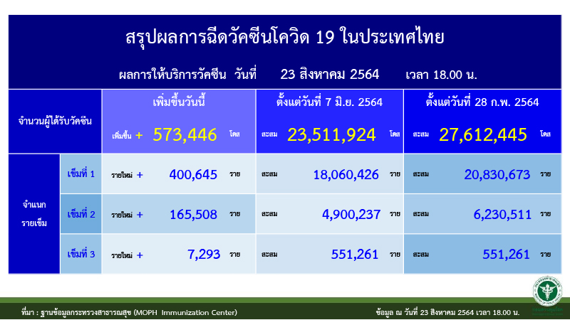 นอกจากนั้น มีผู้ได้รับวัคซีนเข็มแรกเพิ่ม 400,645 ราย เข็มที่ 2 เพิ่ม 165,508 ราย และเข็มที่ 3 เพิ่ม 7,293 ราย รวมสะสม 27,612,445 โดส แบ่งเป็น ผู้ได้รับวัคซีนเข็มแรก จำนวน 20,830,673 ราย ผู้ได้รับวัคซีนเข็มที่ 2 จำนวน 6,230,511 ราย และผู้ได้รับวัคซีนเข็มที่ 3 จำนวน 551,261 ราย