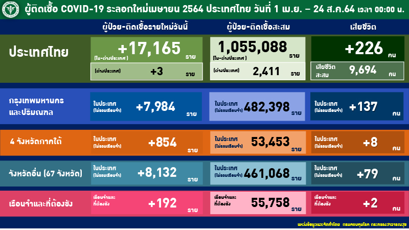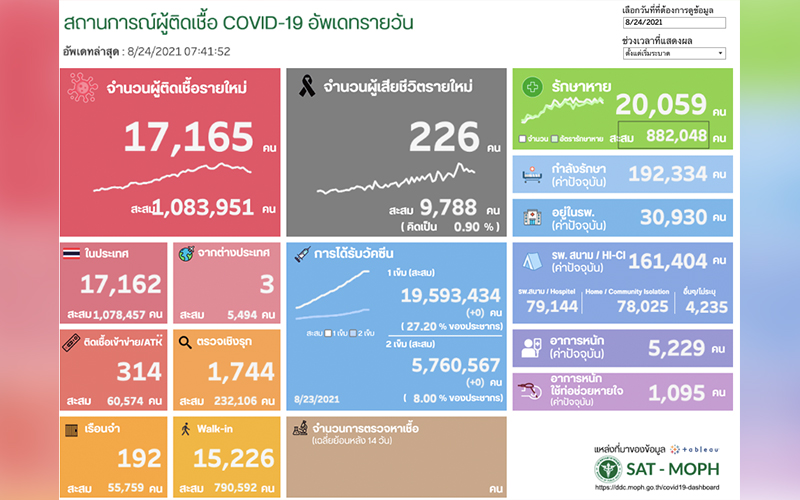 โควิดวันนี้มี พบผู้ติดเชื้อรายใหม่ลดลงจากสองหมื่นเหลือ 17,165 ราย เฉพาะ 3 จังหวัดติดโควิดพุ่งหลักพัน ทำให้มีผู้ป่วยสะสมทั้งหมด 1,083,951 ราย และมีผู้หายป่วยมากกว่ายอดติดเชื้อ อยู่ที่ 20,059 ราย ตายยังสูง 226 ราย เสียชีวิตที่บ้าน 2 รายและเป็นหญิงตั้งครรภ์ 1 ราย ขณะที่ฉีดวัคซีนเพิ่มขึ้น 573,446 โดส