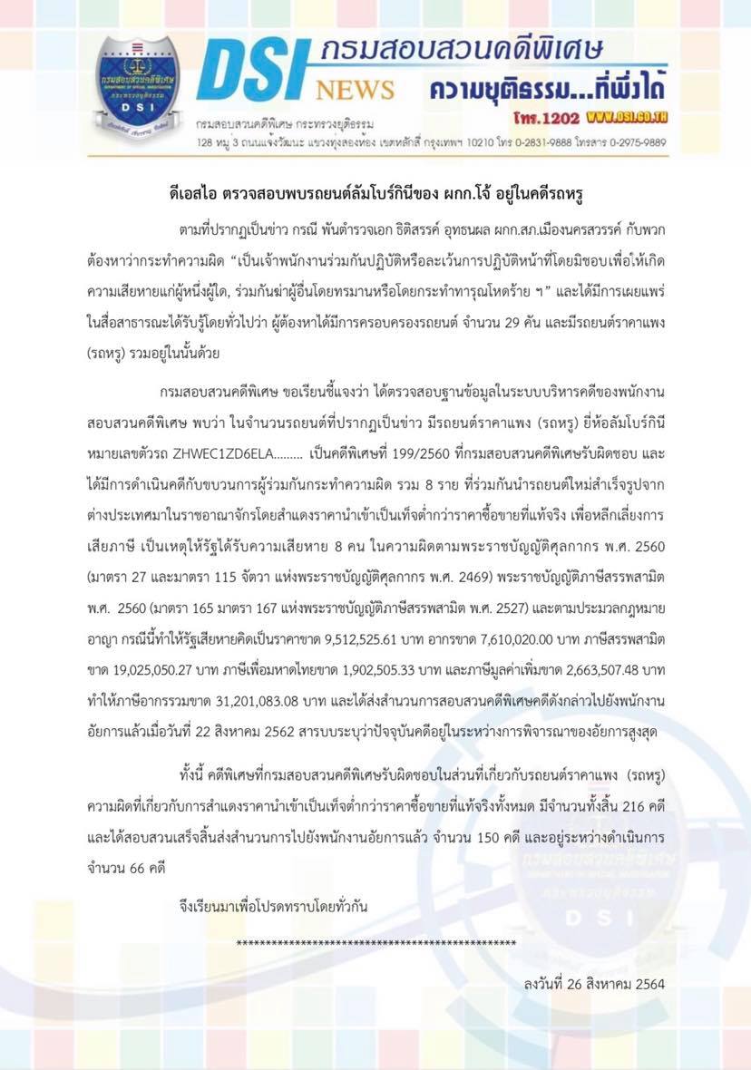 ‘ดีเอสไอ’ แถลงคอนเฟิร์ม! แลมโบกินี ‘ผู้กำกับโจ้’ อยู่ในสำนวนคดีรถหรูเลี่ยงภาษี รัฐเสียหายรวมกว่า 31 ล้าน ส่ง อสส.แล้ว 22 ส.ค. ยังอยู่ระหว่างการพิจารณา - อธิบดีกรมศุลกากรรับมีการครอบครองรถหรูจริง 29 คัน เผยปี 54-60 เป็นเจ้าของสำนวนคดีนำจับ 368 คัน ได้สินบนนำจับ-เงินรางวัลรวม 55% ต่อคัน