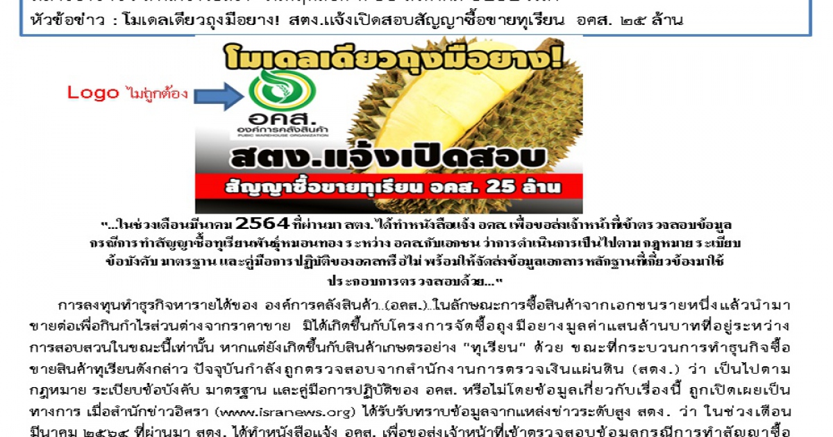 หลัง 'อิศรา' ตีข่าว สตง.แจ้งเปิดสอบสัญญาซื้อขายทุเรียน 25 ล้าน โมเดลเดียวถุงมือยาง ฝ่ายพีอาร์ อคส.ยังไม่ชี้แจงข่าว แต่แจ้งขอให้แก้ไขโลโก้ประกอบภาพข่าวใหม่