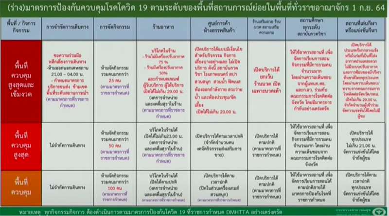 - ร้านอาหาร ร้านอาหารที่อยู่นอกอาคาร หรือในอาคารแต่ไม่มีเครื่องปรับอากาศ มีอากาศถ่ายเทดี ให้นั่งรับประทานได้ 75 % ส่วนร้านอาหารที่เป็นห้องที่มีเครื่องปรับอากาศ ให้นั่งรับประทานได้ 50 % และเปิดได้ไม่เกิน 20.00 น. พร้อมย้ำให้งดจำหน่ายและดื่มสุราในร้าน