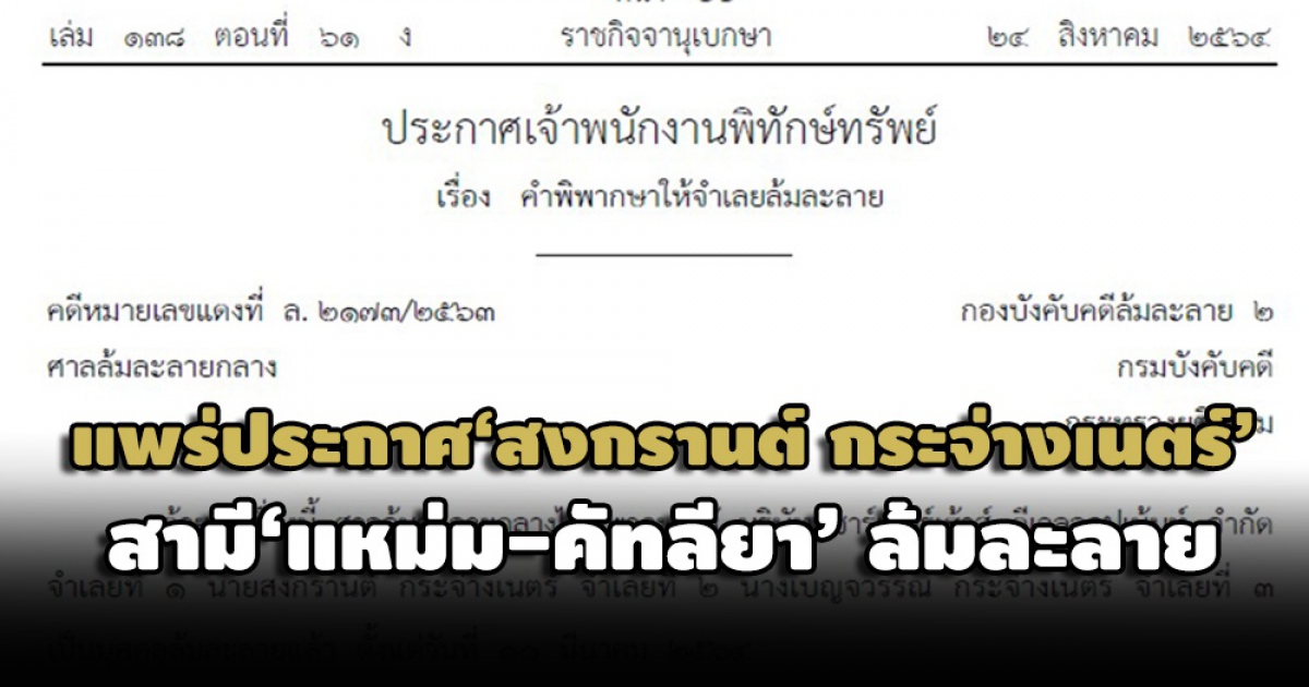 ราชกิจจาฯแพร่ประกาศเจ้าพนักงานพิทักษ์ทรัพย์ ‘สงกรานต์ กระจ่างเนตร์’ นักธุรกิจสามีอดีตนักแสดงสาว บุคคลล้มละลาย หลังพิทักษ์ทรัพย์เด็ดขาด แบงก์กรุงไทย จำกัด (มหาชน) ยื่นฟ้อง