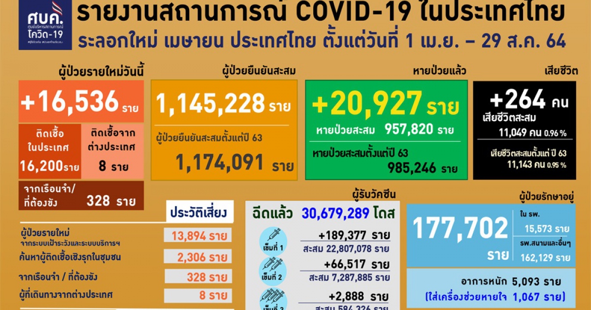 สำนักข่าวอิศรา (www.isranews.org) รายงานว่า เมื่อวันที่ 29 ส.ค.2564 ศูนย์บริหารสถานการณ์โควิด (ศบค.) รายงานสถานการณ์ประจำวัน พบผู้ป่วยรายใหม่ 16,536 ราย ติดเชื้อในประเทศ 16,200 ราย มาจากระบบบริการ 13,894 ราย เกิดจากการตรวจคัดกรองเชิงรุก 2,306 ราย ติดเชื้อในเรือนจำ 328 ราย และอีก 8 รายเดินทางกลับจากต่างประเทศ ทำให้มีผู้ป่วยสะสมทั้งหมด 1,174,091 ราย และมีผู้ติดเชื้อเข้าข่าย (ATK) จำนวน 2,670 ราย