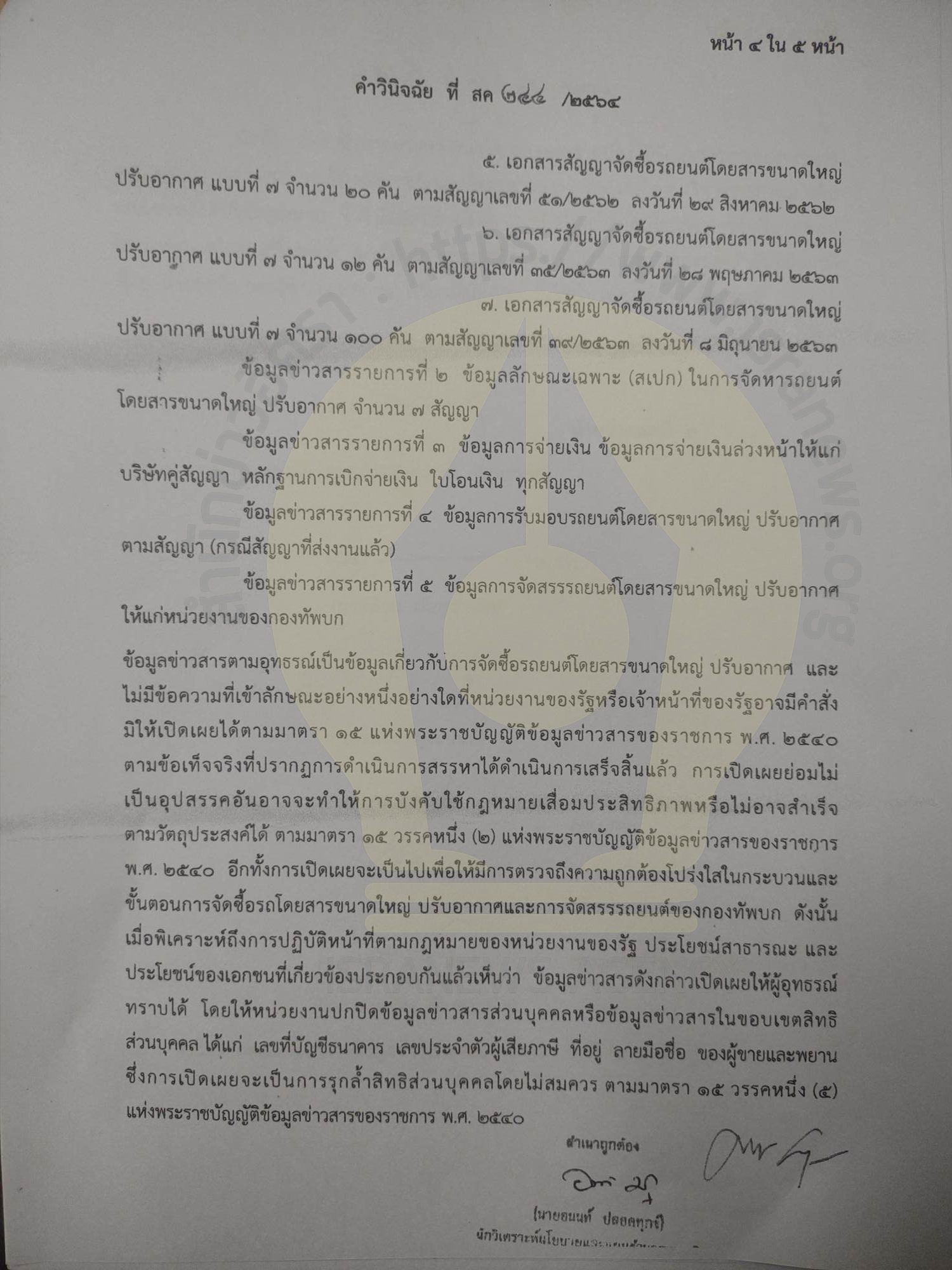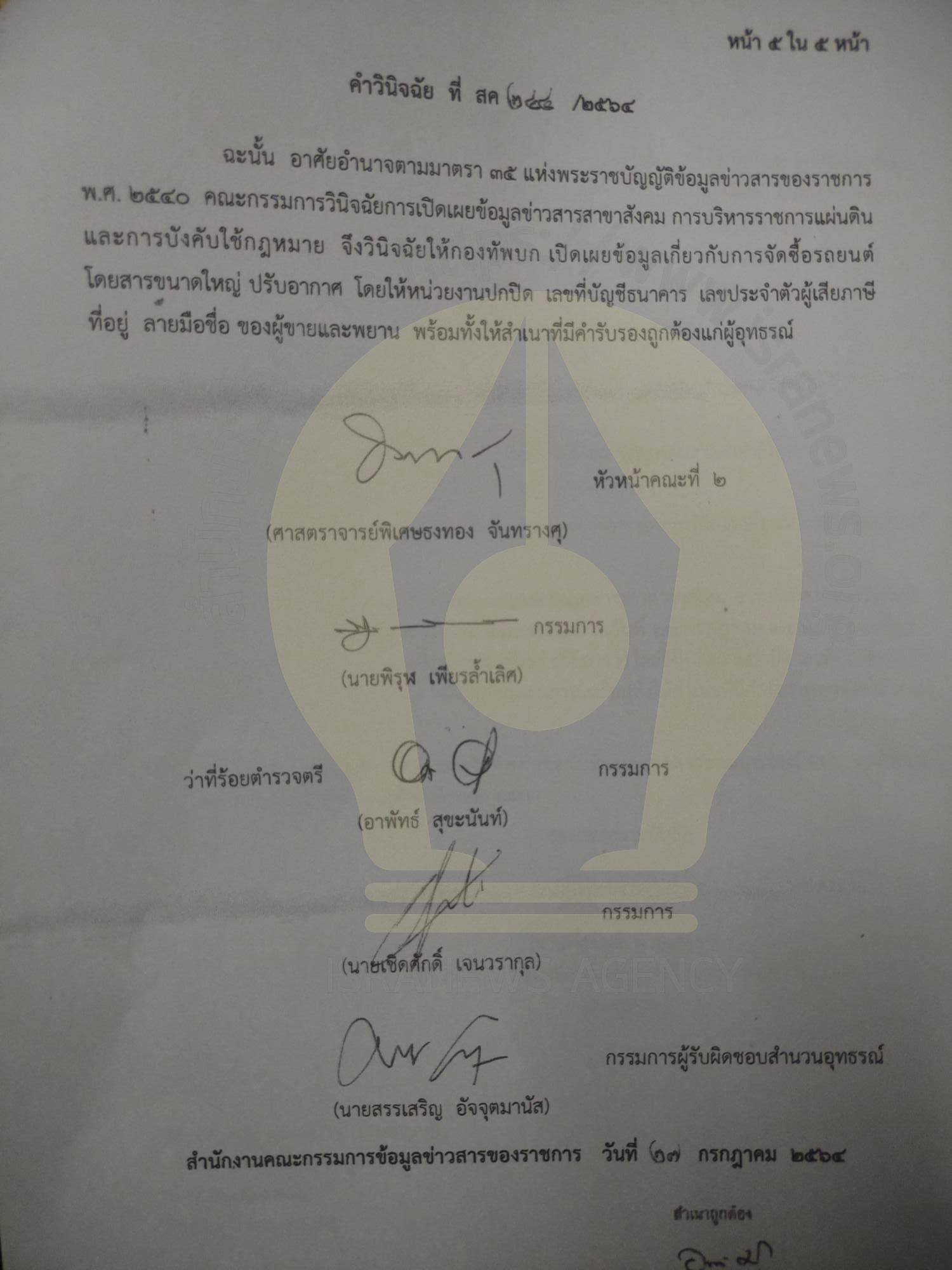 ล่าสุด คณะกรรมการวินิจฉัยการเปิดเผยข้อมูลข่าวสารสาขาสังคม การบริหารราชการแผ่นดินและการบังคับใช้กฎหมาย สำนักงานปลัดสำนักนายกรัฐมนตรี ได้มีหนังสือลงวันที่ 25 ส.ค.2564 แจ้งผู้สื่อข่าวสำนักข่าวอิศรา ระบุคำวินิจฉัย ที่ สค 244/2564 ลงวันที่ 27 กรกฎาคม 2564 ให้กองทัพบก เปิดเผยข้อมูลเกี่ยวกับการจัดซื้อรถยนต์โดยสารขนาดใหญ่ ปรับอากาศ โดยให้หน่วยงานปกปิด เลขที่บัญชีธนาคาร เลขประจําตัวผู้เสียภาษีที่อยู่ ลายมือชื่อ ของผู้ขายและพยาน พร้อมทั้งให้สําเนาที่มีคํารับรองถูกต้องแก่สำนักข่าวอิศรา