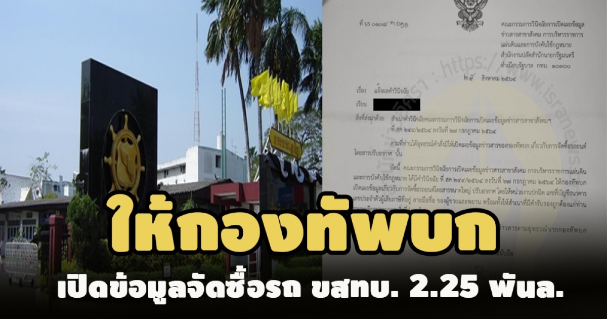คกก.ข้อมูลข่าวสารฯ แจ้งผลวินิจฉัยอุทธรณ์ให้กองทัพบกเปิดเผยข้อมูลจัดซื้อรถ ขสทบ. 2,250 พันล. แก่ อิศรา ชี้เป็นประโยชน์ต่อสาธารณะตรวจสอบความถูกต้องโปร่งใส-ไม่เป็นอุปสรรคทําให้การบังคับใช้กม.เสื่อมประสิทธิภาพ
