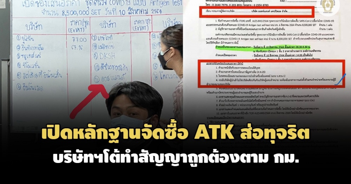 'ชมรมแพทย์ชนบท' เปิดหลักฐานร่องรอยส่อทุจริต จัดซื้อ ATK 8.5 ล้านชิ้น เรียกร้อง 5 หน่วยงานรัฐ เร่งสอบข้อเท็จจริงด่วน ด้าน 'บริษัทเวิลด์ เมดิคอลฯ' ร่อนหนังสือชี้แจงเป็นตัวแทนบริษัทออสท์แลนด์ฯ ยันทำสัญญาซื้อขายถูกต้องตามกฎหมาย ขณะที่ 'รสนา' ตั้ง 7 ข้อสังเกต 7 ข้อ อภ.สัญญาจัดซื้อผิดกฎหมายจัดซื้อจัดจ้าง