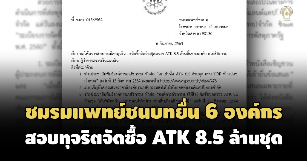 ชมรมแพทย์ชนบท ทำหนังสือถึง 6 องค์กร สตง.-กรมบัญชีกลาง-อภ.-สปสช.-กรมการแพทย์-รพ.ราชวิถี ขอให้ตรวจสอบกรณีส่อทุจริตการจัดซื้อ ATK 8.5 ล้านชุด