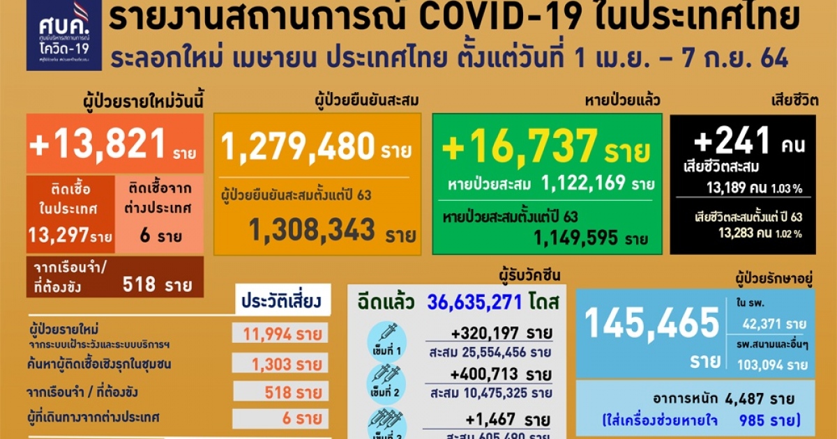 สำนักข่าวอิศรา (www.isranews.org) รายงานว่า เมื่อวันที่ 7 ก.ย.2564 ศูนย์บริหารสถานการณ์โควิด (ศบค.) รายงานสถานการณ์ประจำวัน พบผู้ป่วยรายใหม่ 13,821 ราย แบ่งเป็น ผู้ติดเชื้อในประเทศ 13,297 ราย และผู้ติดเชื้อจากต่างประเทศ 6 ราย โดยเป็นผู้ป่วยรายใหม่จากระบบเฝ้าระวังและบริการฯ 11,994 ราย มาจากการค้นหาเชิงรุกในชุมชน 1,303 ราย มาจากเรือนจำ 518 ราย และอีก 6 รายเดินทางมาจากต่างประเทศ ทำให้มีผู้ป่วยสะสมทั้งหมด 1,308,343 ราย และมีผู้ป่วยติดเชื้อเข้าข่าย (ATK) 1,112 ราย