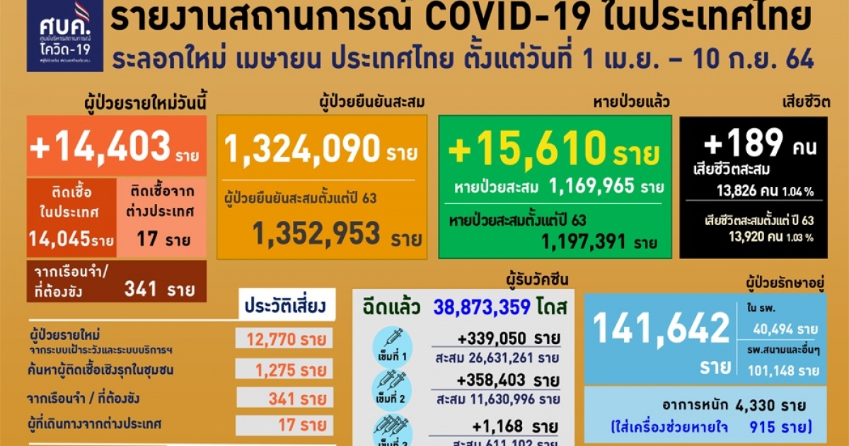 สำนักข่าวอิศรา (www.isranews.org) รายงานว่า เมื่อวันที่ 10 ก.ย.2564 นพ.ทวีศิลป์ วิษณุโยธิน โฆษกศูนย์บริหารสถานการณ์โควิด (ศบค.) รายงานสถานการณ์ประจำวัน พบผู้ป่วยรายใหม่ 14,403 ราย ติดเชื้อในประเทศ 14,045 ราย มาจากระบบบริการ 12,770 ราย เกิดจากการตรวจคัดกรองเชิงรุก 1,275 ราย ติดเชื้อในเรือนจำ 341 ราย และอีก 17 รายเดินทางกลับจากต่างประเทศ ทำให้มีผู้ป่วยสะสมทั้งหมด 1,352,953 ราย และมีผู้ติดเชื้อเข้าข่าย (ATK) จำนวน 1,945 ราย