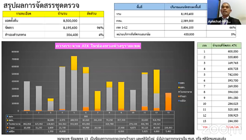 ทั้งนี้หากแยกแผนการกระจาย ATK ออกเป็นรายพื้นที่ จะแบ่งออกเป็น พื้นที่ กทม. จำนวน 2,389,500 ชุด พื้นที่ 12 เขตสุขภาพทั่วประเทศ (ยกเว้น กทม.) จำนวน 5,406,100 ชุด และหน่วยบริการสังกัดกรมอนามัย เพื่อกระจายที่ตลาด จำนวน 400,000 ชุด
