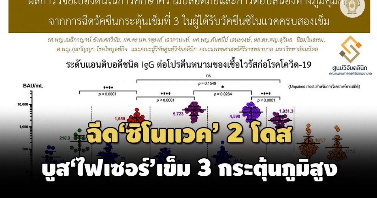 ผู้สื่อข่าวรายงานว่า เมื่อวันที่ 11 ก.ย.2564 ศูนย์วิจัยคลินิก คณะแพทยศาสตร์ศิริราช โพสต์ข้อความผ่านเฟซบุ๊ก Siriraj Institute of Clinical Research อัปเดตรายงานผลการวิจัยโครงการฉีดวัคซีนกระตุ้นเข็ม 3 ในผู้ที่ได้รับวัคซีนซิโนแวคครบ 2 เข็ม ด้วยวัคซีนไฟเซอร์ ระบุว่า หลังจากรับวัคซีนซิโนแวคครบ 2 เข็ม เป็นระยะเวลา 8-12 สัปดาห์ ระดับภูมิคุ้มกันหรือแอนติบอดีชนิด IgG เฉลี่ยอยู่ที่ 45-53 หน่วยต่อมิลลิลิตร เมื่อได้รับวัคซีนกระตุ้นเข็มที่ 3 ด้วยไฟเซอร์ขนาดเต็มโดส (0.3 มิลลิลิตร) มีระดับแอนติบอดีชนิด IgG ขึ้นเฉลี่ย 5,723 หน่วยต่อมิลลิลิตร
