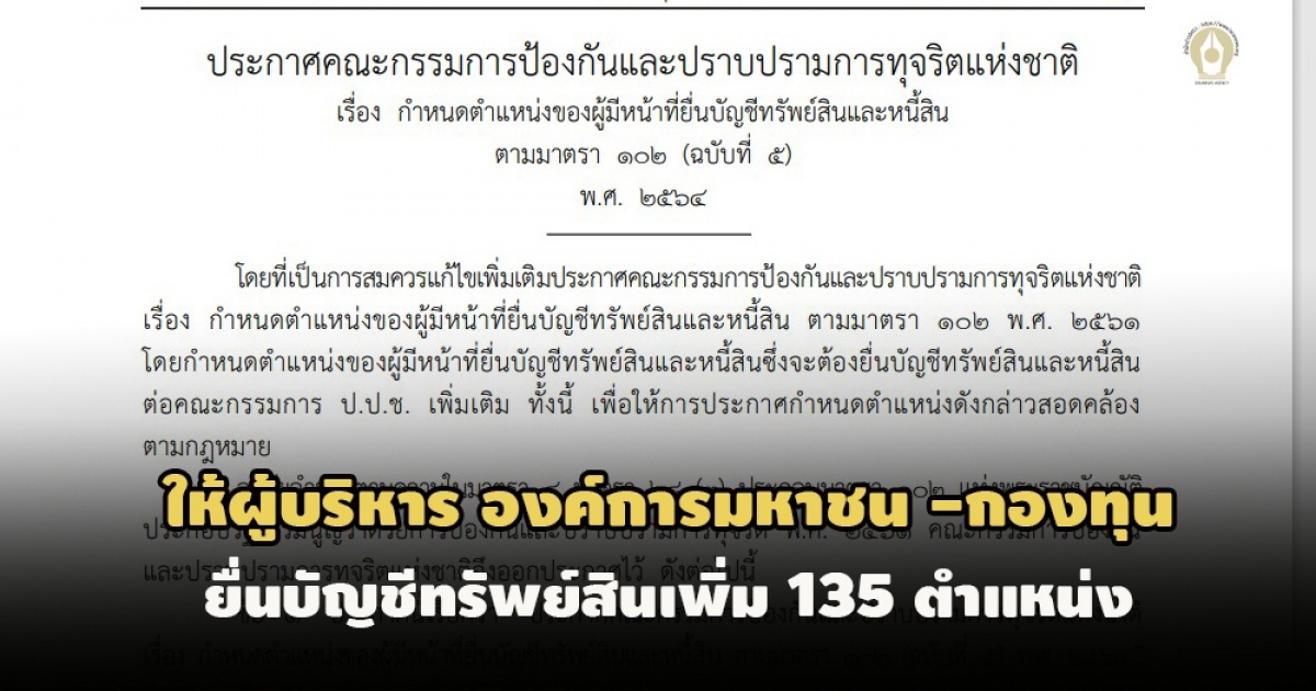 ราชกิจจาฯ เผยแพร่ประกาศ ป.ป.ช.ให้ จนท.รัฐ ยื่นบัญชีทรัพย์สินและหนี้สินเพิ่มเติม ในส่วนองค์การมหาชน-กองทุน จำนวนกว่า 135 ตำแหน่งรองผู้จัดการ รองผู้อำนวยการ รองเลขาธิการ แต่ระดับ ผู้จัดการ ผู้อำนวยการ เลขาธิการ เมื่อยื่นแล้วต้องเปิดเผย ใช้บังคับเมื่อพ้นกำหนดสามสิบวัน
