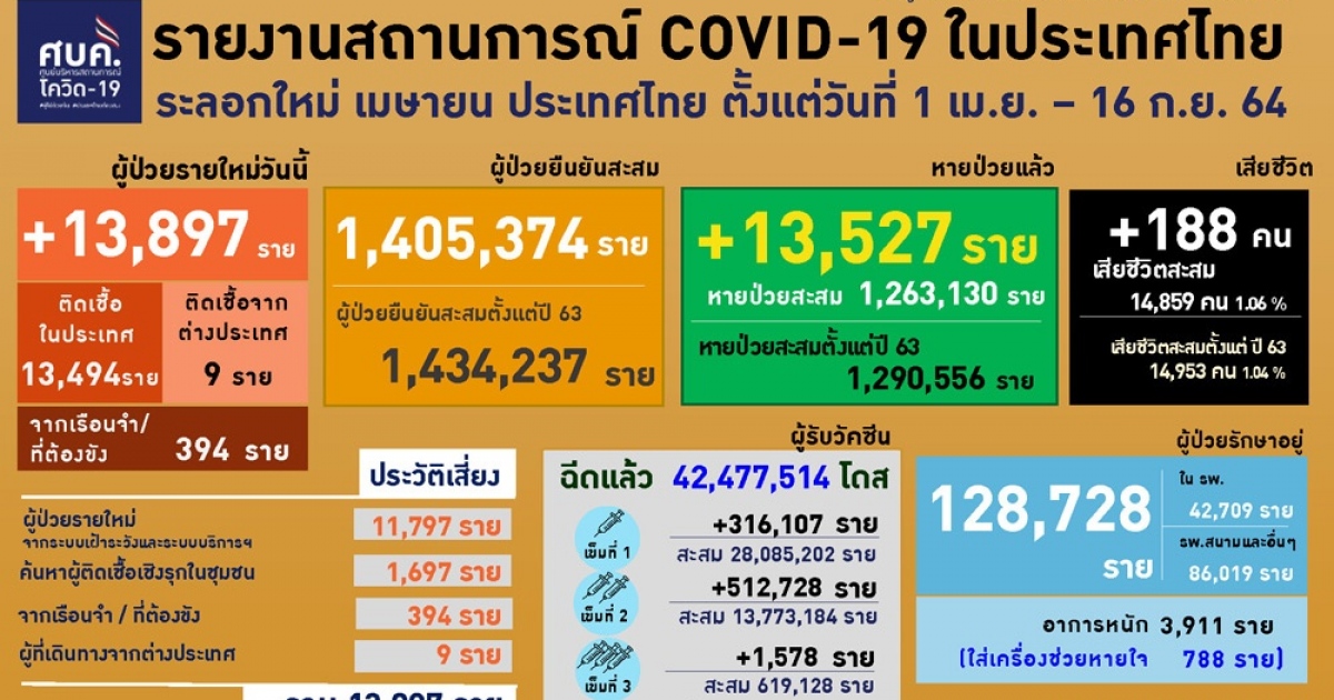 สำนักข่าวอิศรา (www.isranews.org) รายงานว่า เมื่อวันที่ 16 ก.ย. 2564 ศูนย์บริหารสถานการณ์โควิด (ศบค.) เผยแพร่สถานการณ์โควิดประจำวัน โดยพบผู้ติดป่วยรายใหม่ 13,879 ราย แบ่งเป็นการติดเชื้อในประเทศ 13,494 ราย เกิดจากระบบเฝ้าระวังและระบบบริการฯ 11,797 ราย เกิดจากการค้นหาเชิงรุกและพบการติดเชื้อในชุมชน 1,697 ราย ติดเชื้อภายในเรือนจำ 394 ราย และอีก 9 รายเดินทางกลับมาจากต่างประเทศ รวมผู้ป่วยสะสม 1,434,237ราย หายป่วยเพิ่ม 13,527 ราย อยู่ระหว่างรักษาตัวในโรงพยาบาล 128,728 ราย โดยในจำนวนนี้มีอาการหนัก 3,911 ราย และใส่ท่อช่วยหายใจ 788 ราย เสียชีวิตเพิ่ม 188 ราย รวมเสียชีวิตสะสม 14,953 ราย