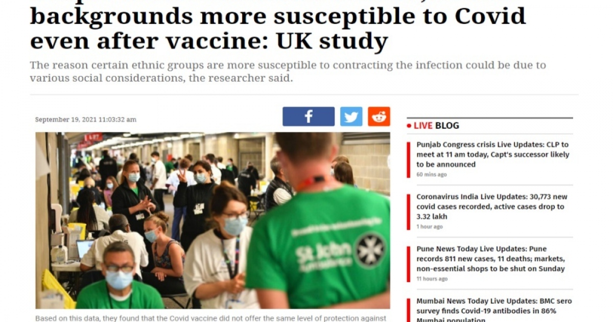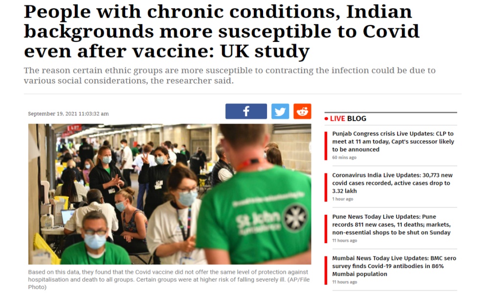 สำนักข่าวอิศรา (www.isranews.org) รายงานสถานการณ์อันเกี่ยวข้องกับการระบาดของไวรัสโควิด-19 หรือโคโรน่าไวรัสว่าที่ประเทศอังกฤษนั้นได้มีการเปิดเผยผลการศึกษาระบุว่าผู้ที่มีอาการป่วยเรื้อรัง ผู้ที่มีอาการป่วยดาวน์ซินโดรม ผู้ที่สูงอายุ รวมไปถึงผู้ที่มีพื้นเพมาจากประเทศปากีสถาน,และประเทศอินเดียนั้นจะมีแนวโน้มที่จะเข้ารับการรักษาในโรงพยาบาลหรืออาจจะเสียชีวิตจากไวรัสโควิด-19 ได้มากกว่า แม้ว่าบุคคลผู้นั้นจะได้รับวัคซีนไปแล้ว