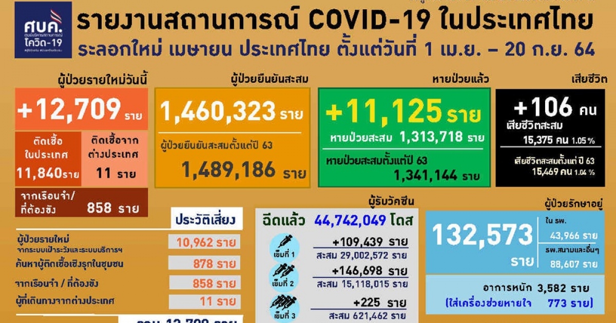 สำนักข่าวอิศรา (www.isranews.org) รายงานว่า เมื่อวันที่ 20 ก.ย.2564 พญ.อภิสมัย ศรีรังสรรค์ ผู้ช่วยโฆษกศูนย์บริหารสถานการณ์โควิด (ศบค.) รายงานสถานการณ์ประจำวัน พบผู้ป่วยรายใหม่ 12,709 ราย ติดเชื้อในประเทศ 11,840 ราย มาจากระบบบริการ 10,962 ราย เกิดจากการตรวจคัดกรองเชิงรุก 878 ราย ติดเชื้อในเรือนจำ 858 ราย และอีก 11 รายเดินทางกลับจากต่างประเทศ ทำให้มีผู้ป่วยสะสมทั้งหมด1,489,186 ราย และมีผู้ติดเชื้อเข้าข่าย (ATK) จำนวน 1,723 ราย