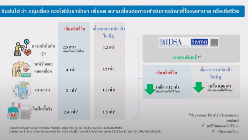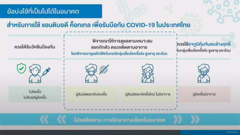 “ขณะนี้ยาต้านไวรัสทุกตัวที่ใช้อยู่ ยังมีคำถามมากมาย ทั้งยาฟาวิพิราเวียร์ เรมเดซิเวียร์ รวมถึงฟ้าทะลายโจรก็ยังมีคำถาม ดังนั้นตอนนี้เลยมีความพยายามหายาต้านไวรัสหลายตัว สำหรับยาแอนติบอดี ค็อกเทล มีความน่าสนใจ เพราะบล็อกเชื้อไวรัสไม่ให้เข้าเซลล์ได้ ผมมองว่าจะเป็นหนึ่งตัวที่มาช่วยคนไข้ความเสี่ยงสูงได้ดีพอสมควร” ผศ.นพ.กำธร กล่าว