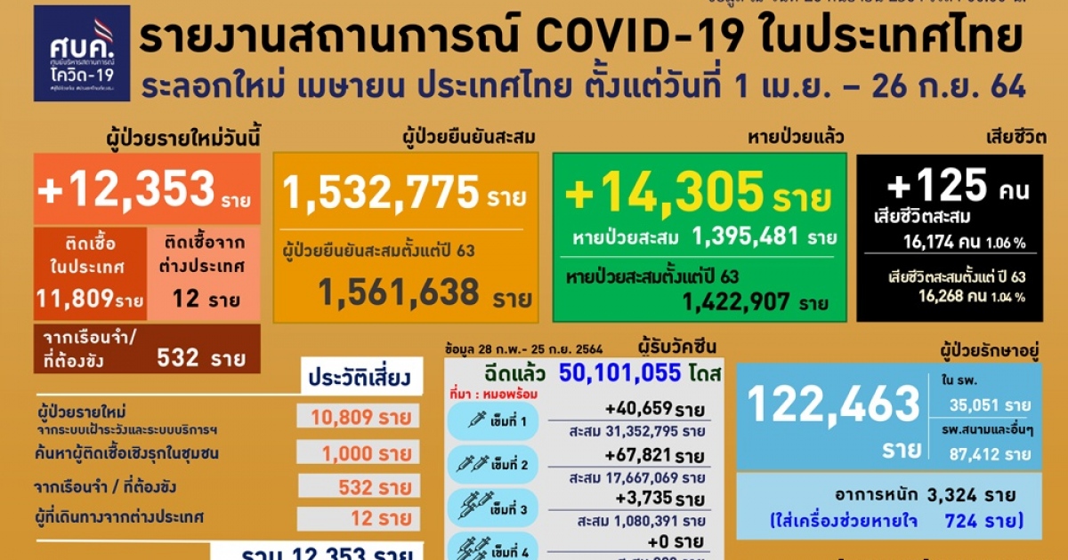 สถานการณ์โควิด ล่าสุด 26 ก.ย.64 มีผู้ติดเชื้อรายใหม่ 12,353 ราย ยอดสะสม 1,561,638 ราย หายป่วย 14,305 ราย อยู่ระหว่างการรักษา 122,463 เสียชีวิตเพิ่ม 125 ราย ไทยขยับขึ้นอันดับที่ 28 ของโลก