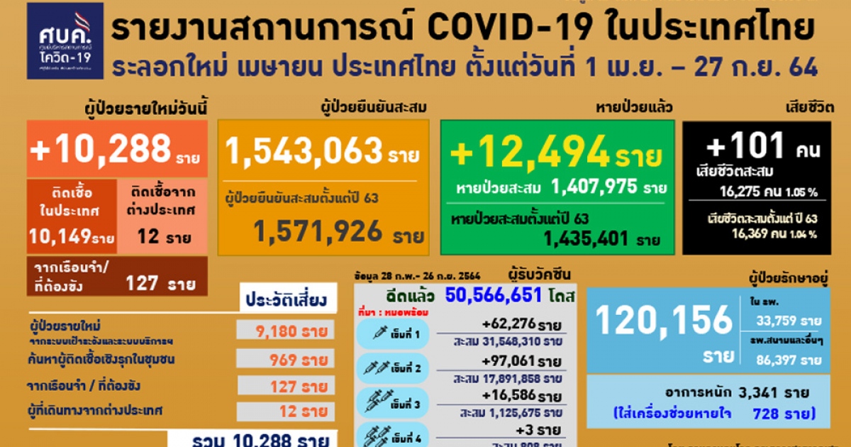 สำนักข่าวอิศรา (www.isranews.org) รายงานว่า เมื่อวันที่ 27 ก.ย.2564 ศูนย์บริหารสถานการณ์โควิด (ศบค.) รายงานสถานการณ์ประจำวัน พบผู้ป่วยรายใหม่ 10,288 ราย ติดเชื้อในประเทศ 10,149 ราย มาจากระบบบริการ 9,180 ราย เกิดจากการตรวจคัดกรองเชิงรุก 969 ราย ติดเชื้อในเรือนจำ 127 ราย และอีก 12 รายเดินทางกลับจากต่างประเทศ ทำให้มีผู้ป่วยสะสมทั้งหมด 1,571,926 ราย และมีผู้ป่วยติดเชื้อเข้าข่าย (ATK) 2,306 ราย
