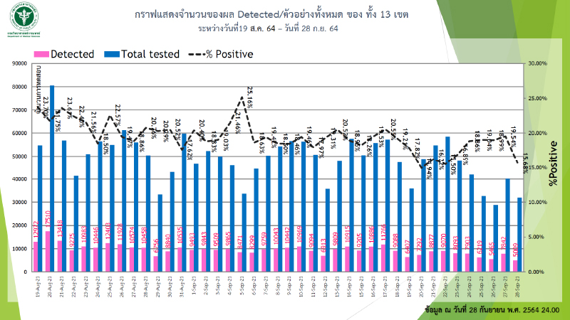 สำนักข่าวอิศรา (www.isranews.org) รายงานว่า เมื่อวันที่ 29 ก.ย.2564 พญ.อภิสมัย ศรีรังสรรค์ ผู้ช่วยโฆษกศูนย์บริหารสถานการณ์โควิด (ศบค.) รายงานสถานการณ์ประจำวัน พบผู้ป่วยรายใหม่ 10,414 ราย ติดเชื้อในประเทศ 10,226 ราย มาจากระบบบริการ 9,044 ราย เกิดจากการตรวจคัดกรองเชิงรุก 1,182 ราย ติดเชื้อในเรือนจำ 178 ราย และอีก 10 รายเดินทางกลับจากต่างประเทศ ทำให้มีผู้ป่วยสะสมทั้งหมด 1,591,829 ราย และมีผู้ติดเชื้อเข้าข่าย (ATK) จำนวน 5,100 ราย