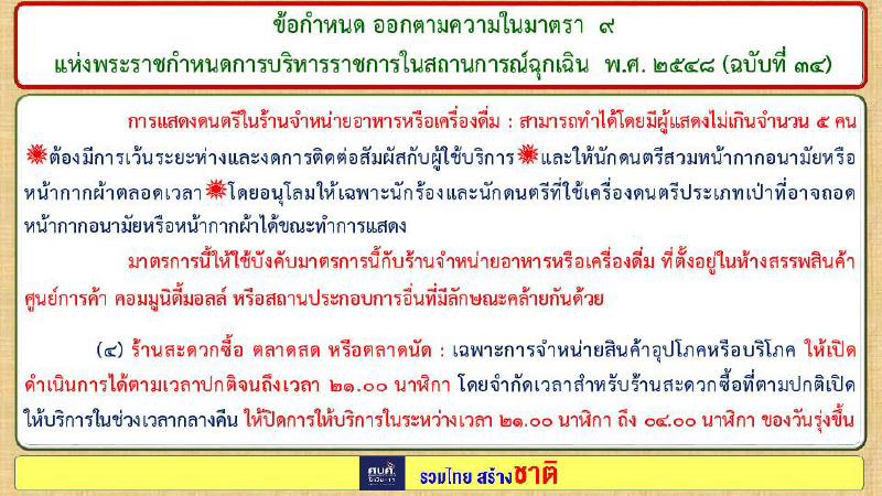 3.ร้านจำหน่ายอาหารหรือเครื่องดื่ม เปิดให้บริการได้ถึง 21.00 น.แต่ห้ามบริโภคสุราหรือเครื่องดื่มที่มีแอลกอฮอล์ และจำกัดจำนวนผู้นั่งบริโภคในร้าน นอกจากนั้นอนุญาตให้แสดงดนตรีในร้านได้ โดยผู้แสดงไม่เกิน 5 คน ต้องมีการเว้นระยะห่าง และต้องสวมหน้ากากอนามัย โดยนักร้องหรือนักดนตรีใช้เครื่องเป่ามีการอนุโลมให้ถอดขณะทำการแสดงได้