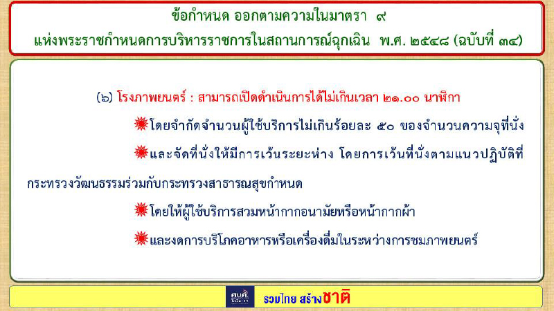 6.โรงภาพยนตร์ เปิดได้ถึง 21.00 น. จำกัดจำนวนผู้ใช้บริการ 50% และจัดให้ที่นั่งเว้นระยะห่าง โดยผู้ใช้บริการสวมหน้ากากอนามัย งดบริโภคอาหารและเครื่องดื่ม โดยให้กระทรวงสาธารณสุข และ กระทรวงวัฒนธรรมกำกับดูแล