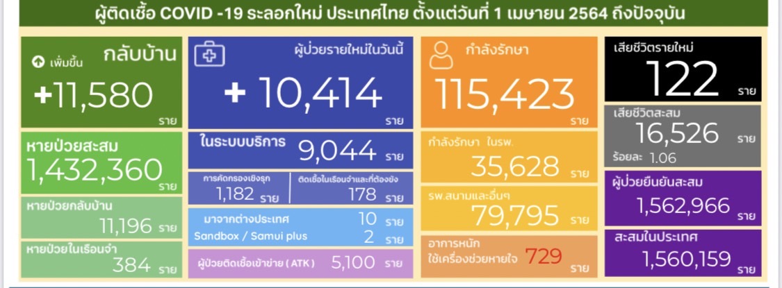 ขณะที่มีผู้หายป่วย 11,580 ราย ทำให้มีผู้หายป่วยสะสม 1,459,786 ราย กำลังรักษาตัวอยู่ 115,423 ราย โดยเป็นผู้ป่วยอาการหนัก 3,232 ราย ใส่ท่อช่วยหายใจ 729 ราย และมีผู้เสียชีวิต 122 ราย รวมผู้เสียชีวิตสะสม 16,620 ราย