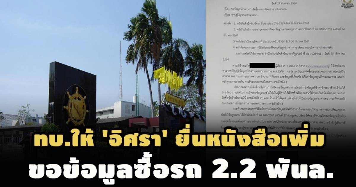 ทบ.ให้ สำนักข่าวอิศรา ทำหนังสือยื่นขอเปิดเผยข้อมูลจัดซื้อรถ ขส.ทบ. 7 ครั้ง 2.25 พัน ล.อีกรอบ 5 ฉบับ หลัง คกก.ข้อมูลข่าวสารแจ้งผลอุทธรณ์เปิดเผยข้อมูลได้ เพื่อความโปร่งใส