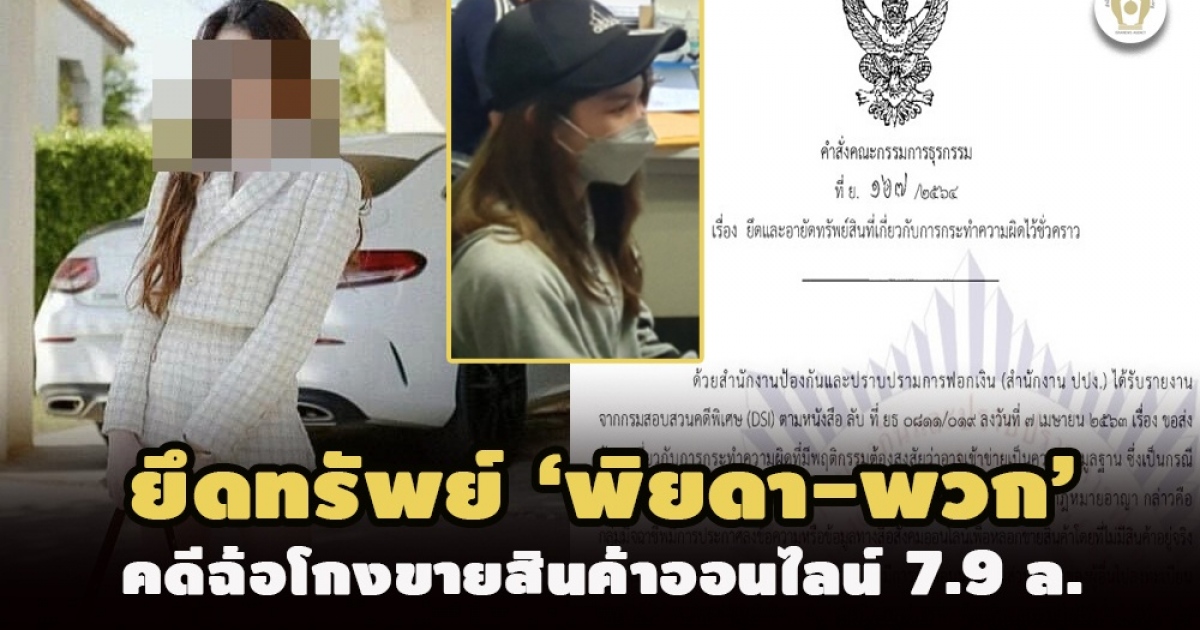 เปิดรายการทรัพย์สิน ‘พิยดา ทองคําพันธ์’ กับพวก 2 คน ปปง.ยึด 10 รายการ 7.9 ล้าน เงินสด โทรมือถือ บ้านที่ดิน เงินฝาก คดีฉ้อโกง แฉพฤติกรรมล้วงข้อมูลบุคคลอื่นลงทะเบียนหลอกขายสินค้าออนไลน์ ไม่มีอยู่จริง ช่วง ม.ค.-ก.ย.2562 เหยื่อ 83 ราย