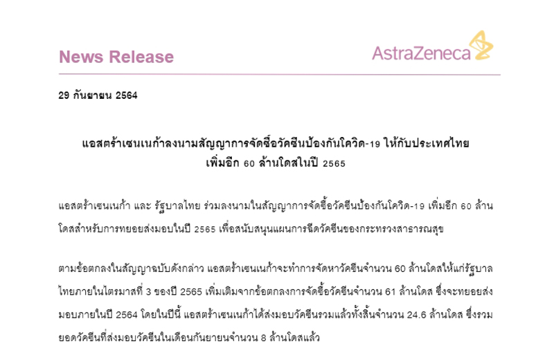 เมื่อวันที่ 29 ก.ย.2564 บริษัท แอสตร้าเซนเนก้า (ประเทศไทย) จำกัด เผยแพร่เอกสาร ระบุว่า ตามข้อตกลงในสัญญาฉบับดังกล่าว แอสตร้าเซนเนก้า จะทำการจัดหาวัคซีนจำนวน 60 ล้านโดสให้แก่รัฐบาลไทยภายใน ไตรมาสที่ 3 ของปี 2565 เพิ่มเติมจากข้อตกลงการจัดซื้อเดิม 61 ล้านโดสที่ทยอยส่งมอบภายในปี 2564 โดยที่ผ่านมาแอสตร้าเซนเนก้าส่งมอบวัคซีนแล้ว 24.6 ล้านโดส ซึ่งรวมยอดที่ส่งมอบเดือน ก.ย.จำนวน 8 ล้านโดสแล้ว