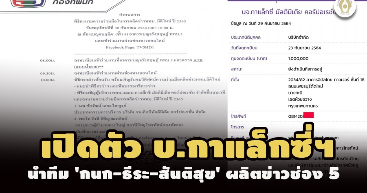 เปิดตัว บ.กาแล็กซี่ นำทีม 'กนก-ธีระ-สันติสุข-สถาพร' ร่วมผลิตข่าว ททบ. 5 เพิ่งจดทะเบียนจัดตั้ง 23 ก.ย.64 ทุน 1 ล้าน 'นพ.ชัยวัฒน์ เตชะไพฑูรย์' ผอ.โครงการสนับสนุนนักรบเสื้อขาวต้านภัย Covid-19 ปธ.กก.