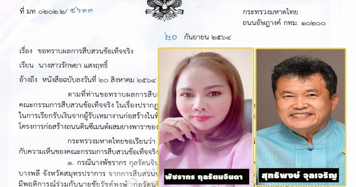 ระบุว่า กระทรวงมหาดไทยได้สรุปผลการสืบสวนข้อเท็จจริงกรณีนี้เป็นทางการ พบว่า กรณีนางพัชรากร กุลรัตนจินดา ปัจจุบันดำรงตำแหน่งปลัดเทศบาลเมืองบางแก้ว อำเภอ บางพลี จังหวัดสมุทรปราการ จากการสืบสวนปรากฏพยานหลักฐานเชื่อได้ว่า นางพัชรากร กุลรัตนจินดา มีพฤติการณ์ร่วมกับ นายชัยรัชต์พงษ์ กุลรัตนจินดา ในการเรียกรับผลประโยชน์ตอบแทนจากโครงการ