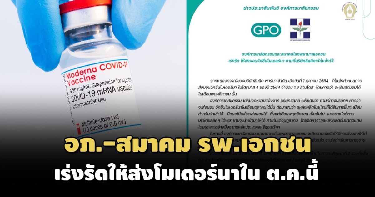 องค์การเภสัชกรรม-สมาคมโรงพยาบาลเอกชน เร่งรัดให้ส่งมอบวัคซีนโมเดอร์นาภายในเดือน ต.ค. เพื่อเร่งกระจายตามที่ รพ.ได้จองไว้ ด้านบริษัท ซิลลิค ฟาร์มาฯ แจงจะหาจากแหล่งอื่นมาทดแทน