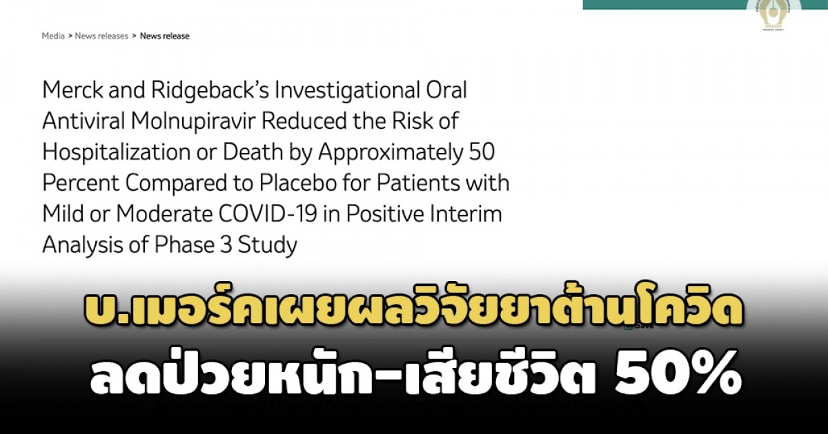 บริษัทเมอร์ค เผยผลการศึกษาเฟส 3 ยาเม็ดต้านโควิด ‘โมลนูพิราเวียร์’ ที่ใช้ในกลุ่มเสี่ยงสูงที่มีอาการน้อย-ปานกลาง พบยาลดอัตราป่วยหนักและเสียชีวิตได้ 50%