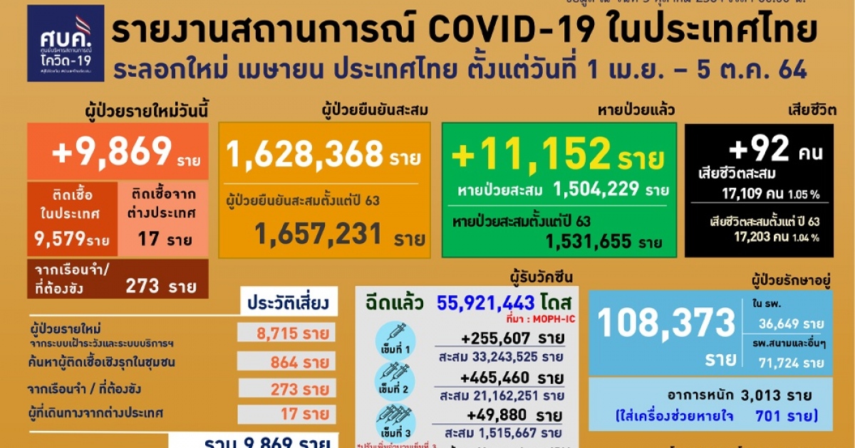 สำนักข่าวอิศรา (www.isranews.org) รายงานว่า เมื่อวันที่ 5 ต.ค.2564 ศูนย์บริหารสถานการณ์โควิด (ศบค.) รายงานสถานการณ์ประจำวัน พบผู้ป่วยรายใหม่ 9,869 ราย ติดเชื้อในประเทศ 9,579 ราย มาจากระบบบริการ 8,715 ราย เกิดจากการตรวจคัดกรองเชิงรุก 864 ราย ติดเชื้อในเรือนจำ 273 ราย และอีก 17 รายเดินทางกลับจากต่างประเทศ ทำให้มีผู้ป่วยสะสมทั้งหมด 1,657,231 ราย และมีผู้ติดเชื้อเข้าข่าย (ATK) จำนวน 3,495 ราย