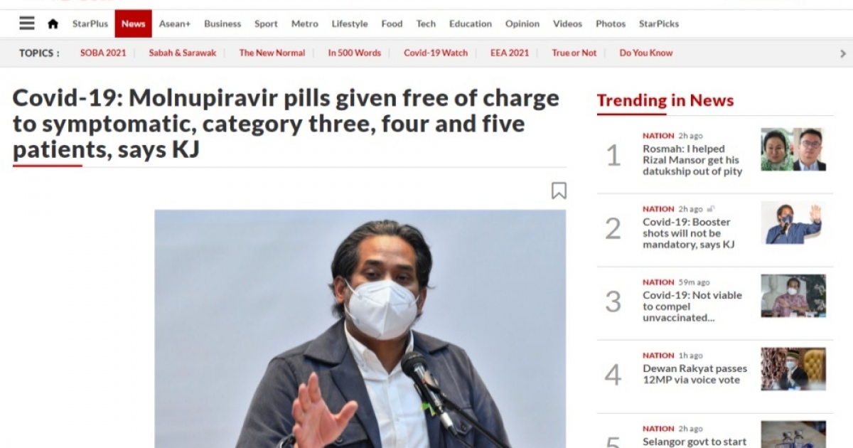 สำนักข่าวอิศรา (www.isranews.org) รายงานสถานการณ์เกี่ยวกับการแพร่ระบาดของไวรัสโควิด-19 หรือโคโรน่าไวรัสว่า ที่ประเทศมาเลเซียนั้นจะมีการแจกยาต้านไวรัสโมลนูพิราเวียร์ ให้กับผู้ป่วยโควิด-19 ซึ่งมีอาการอย่างน้อยภายในระยะเวลา 5 วันหลังจากมีอาการ หรือก็คือจะแจกให้กับกลุ่มผู้ป่วยที่อยู่ในประเภท 3,4 และ5 (กลุ่มผู้ป่วยที่ปอดแสดงอาการว่าติดเชื้อโควิด-19 ชัดเจน)