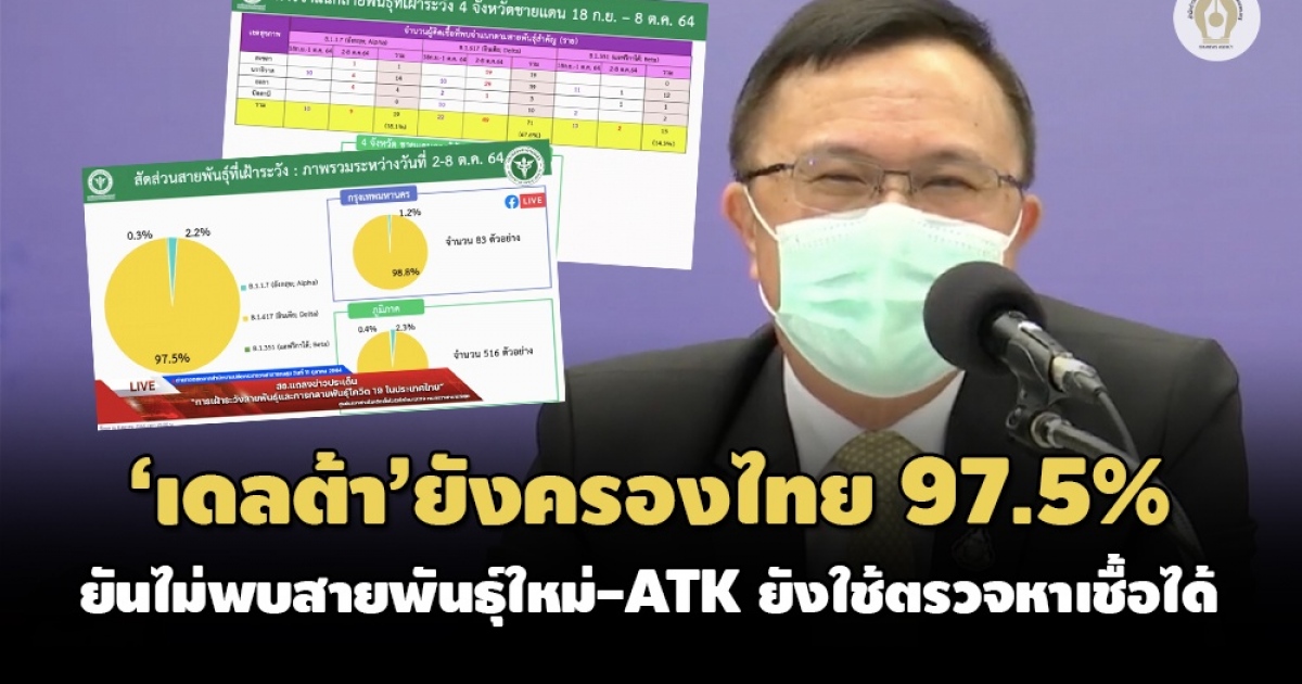 สธ.เผยเดลต้ายังครองไทย 97.5% กทม.พบเพียงสายพันธุ์เดลต้า-อัลฟ่า แต่ใต้เผชิญ 3 สายพันธุ์ ยันยังไม่พบสายพันธุ์ใหม่ ส่วนกรณีเกิดเกิดผลลบลวง ATK ชี้ไม่ได้เกิดจากคุณภาพของชุดตรวจ แต่เป็นข้อจำกัดของเครื่องมือ ยันยังใช้ตรวจหาเชื้อโควิดได้