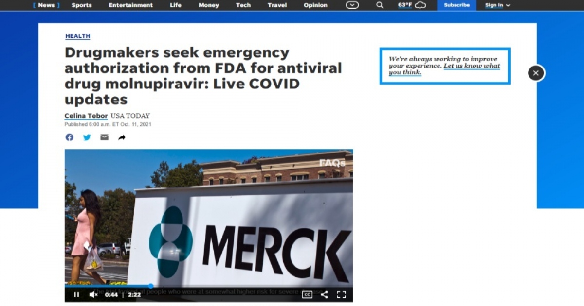 สำนักข่าวอิศรา (www.isranews.org) รายงานสถานการณ์เกี่ยวกับการแพร่ระบาดของไวรัสโควิด-19 หรือโคโรน่าไวรัสว่าบริษัทยาได้แก่บริษัท เมอร์ค แอนด์ โค (Merck & Co) และบริษัท ริดจ์แบ็ก ไบโอเทราพิวติกส์ (Ridgeback Biotherapeutics) ได้ประกาศเมื่อวันที่ 11 ต.ค. ว่าทั้ง 2 บริษัทได้มีการยื่นขออนุญาตกับองค์การอาหารและยาของสหรัฐอเมริกาหรือว่า FDA เพื่อจะให้มีการใช้งานยาโมลนูพิราเวียร์ ซึ่งเป็นยาที่มีความหวังว่าจะมีประสิทธิภาพในการรักษาผู้ป่วยโควิด-19 แล้ว
