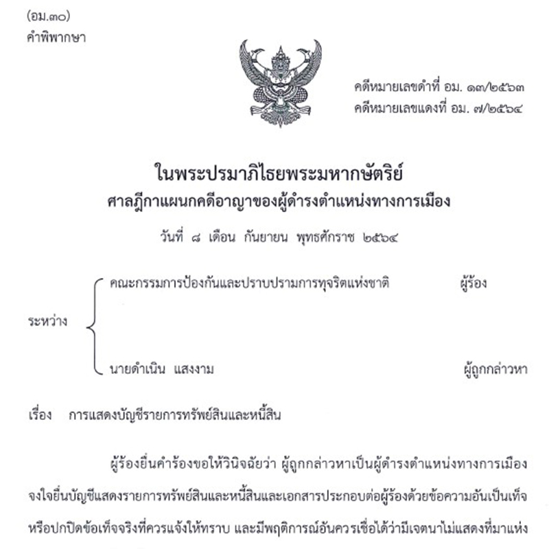 พิพากษาว่า นายดําเนิน แสงงาม ผู้ถูกกล่าวหาจงใจยื่นบัญชีแสดงรายการทรัพย์สินและหนี้สินและเอกสารประกอบต่อคณะกรรมการป้องกันและปราบปรามการทุจริตแห่งชาติด้วยข้อความอันเป็นเท็จหรือปกปิดข้อเท็จจริงที่ควรแจ้งให้ทราบกรณีพ้นจากตําแหน่งรองนายกเทศมนตรีตําบลบางเมือง (วาระที่ 6) อําเภอเมืองสมุทรปราการ จังหวัดสมุทรปราการ ตามพระราชบัญญัติประกอบรัฐธรรมนูญว่าด้วยการป้องกันและปราบปรามการทุจริต พ.ศ. 2542 มาตรา 32 และ มาตรา 33 ห้ามมิให้ผู้ถูกกล่าวหาดํารงตําแหน่งทางการเมืองหรือดํารงตําแหน่งใดในพรรคการเมือง เป็นเวลาห้าปีนับแต่วันที่ 17 มิถุนายน 2558 ซึ่งเป็นวันที่พ้นจากตําแหน่งตามพระราชบัญญัติประกอบรัฐธรรมนูญว่าด้วยการป้องกันและปราบปรามการทุจริต พ.ศ. 2542 มาตรา 34 วรรคสอง กับมีความผิดตามพระราชบัญญัติประกอบรัฐธรรมนูญว่าด้วยการป้องกันและปราบปรามการทุจริต พ.ศ. 2542 มาตรา 119 จําคุก 2 เดือน ผู้ถูกกล่าวหาให้การรับสารภาพ เป็นประโยชน์แก่การ พิจารณา มีเหตุบรรเทาโทษ ลดโทษให้กึ่งหนึ่งตามประมวลกฎหมายอาญา มาตรา 78 คงจําคุก 1 เดือน ผู้ถูกกล่าวหาต้องขังมาพอแก่โทษแล้วจึงให้ปล่อยตัวไป คําขออื่นให้ยก (คดีหมายเลขแดงที่ อม.7 /2564 วันที่ 8 กันยายน 2564)