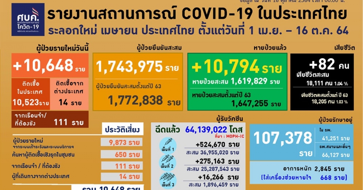 สำนักข่าวอิศรา (www.isranews.org) รายงานว่า เมื่อวันที่ 16 ต.ค. 2564 ศูนย์บริหารสถานการณ์โควิด (ศบค.) เผยแพร่สถานการณ์โควิดประจำวัน โดยพบผู้ติดป่วยรายใหม่ 10,648 ราย แบ่งเป็นการติดเชื้อในประเทศ 10,634 ราย เกิดจากระบบเฝ้าระวังและระบบบริการฯ 9,873 ราย เกิดจากการค้นหาเชิงรุกและพบการติดเชื้อในชุมชน 650 ราย ติดเชื้อภายในเรือนจำ 111 ราย อีก 14 รายเดินทางกลับมาจากต่างประเทศ และมีผู้ติดเชื้อเข้าข่าย (ATK) จำนวน 2,065 ราย รวมผู้ป่วยสะสม 1,772,838 ราย